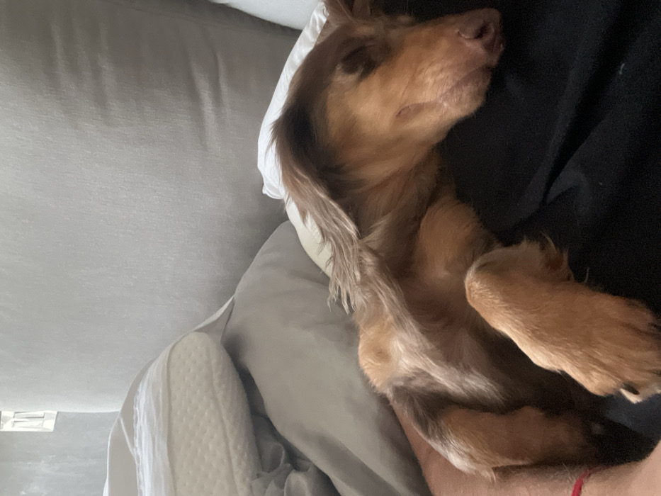 - "A long-haired dachshund sleeps soundly, nestled among pillows and against someone wearing a black shirt" by FM-3rood2, licensed under CC BY 4.0