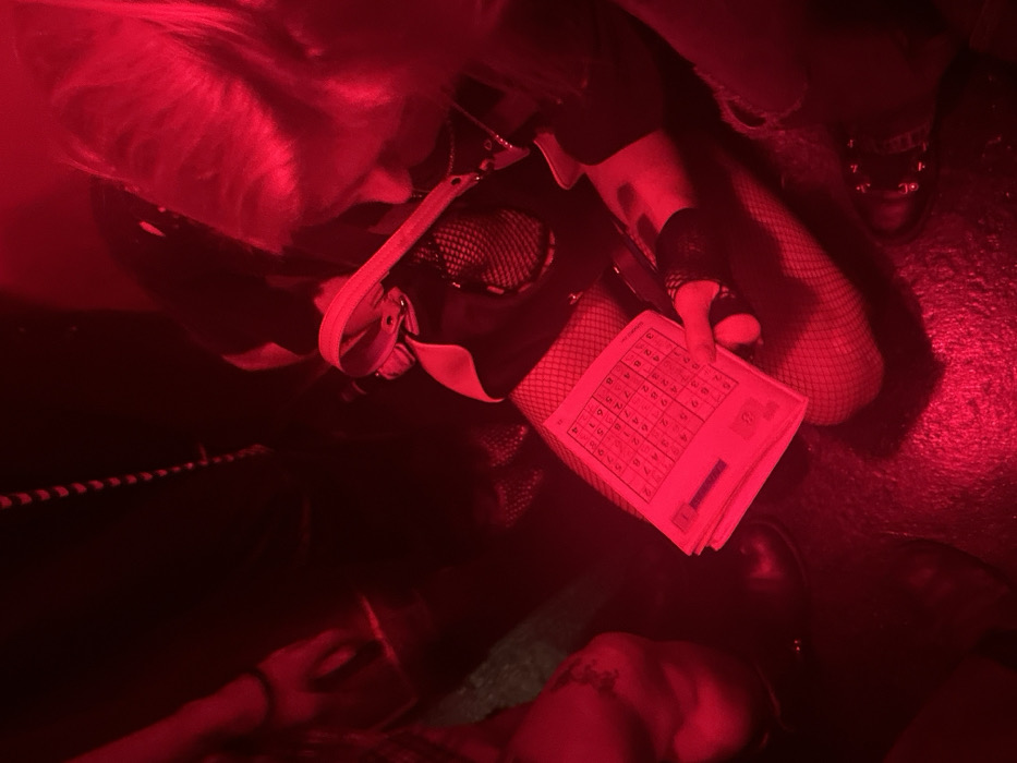 A person is holding a Sudoku puzzle book, wearing fishnet stockings and a black glove, under red lighting. The person is seated with a black bag next to them. Part of a second person with a tattoo on their thigh is visible at the bottom. Shiny black shoes are positioned on the floor nearby. The lighting obscures many details.