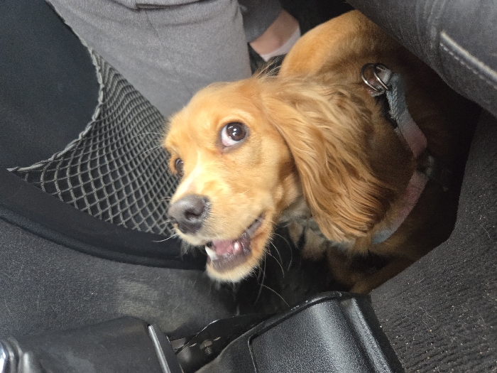 - "A tan-colored dog, resembling a Cocker Spaniel, is positioned within the interior of a vehicle in Cherkovitsa, Bulgaria" by FM-kxY1D3, licensed under CC BY 4.0