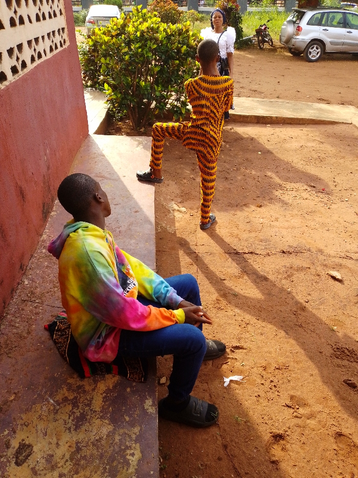 The image captures an outdoor scene in Nsugbe, Nigeria, under direct sunlight, casting prominent shadows. The ground is reddish-brown dirt. In the left foreground, a young male with dark skin and short dark hair is seated on a concrete ledge. He wears a multi-colored tie-dye hooded sweatshirt, dark blue jeans, and dark slip-on sandals. A patterned fabric object lies beneath him on the ledge. His hands are clasped, and his head is slightly elevated, directed towards the right. In the mid-ground, a second young male, also with dark skin, stands with his back largely to the camera. He is dressed in a full-body garment patterned with orange and black chevrons or zigzags. His right leg is bent at the knee with the foot raised, while his left foot rests on the dirt. He wears dark footwear. In the background, a third individual, an adult female with dark skin, stands behind a dense green bush. She wears a white blouse with puffed sleeves and a dark head covering. A silver SUV and a dark motorbike are visible in the far background, suggesting a nearby road or parking area. A red-painted wall and a white, perforated concrete block structure frame the left side of the scene. A small piece of white debris is present on the dirt near the foreground subject's feet.