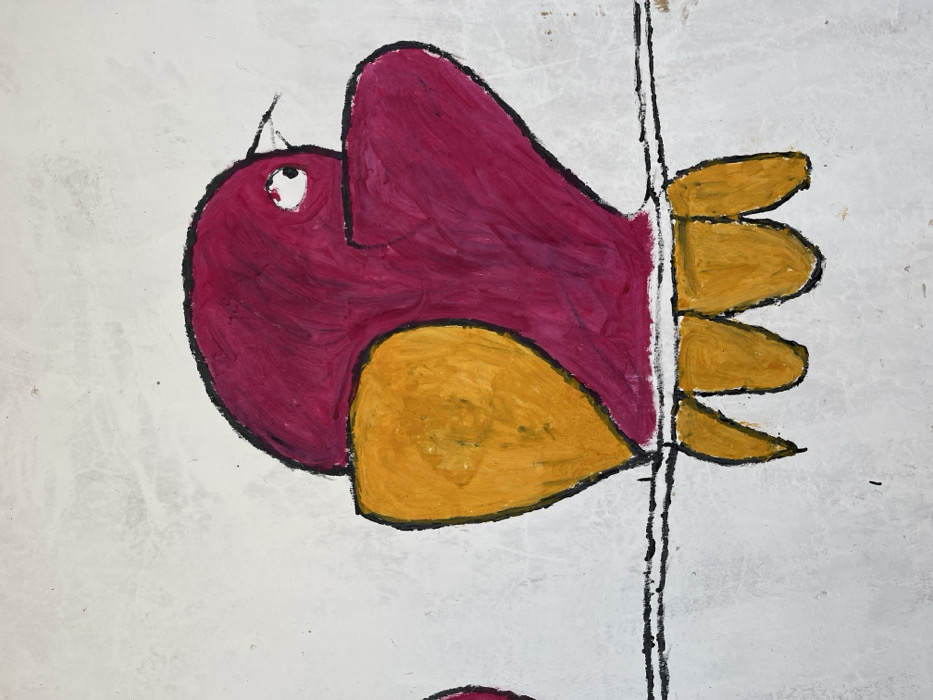 A child-like painting depicts a red and yellow bird perched on a dark, vertical line, possibly a branch