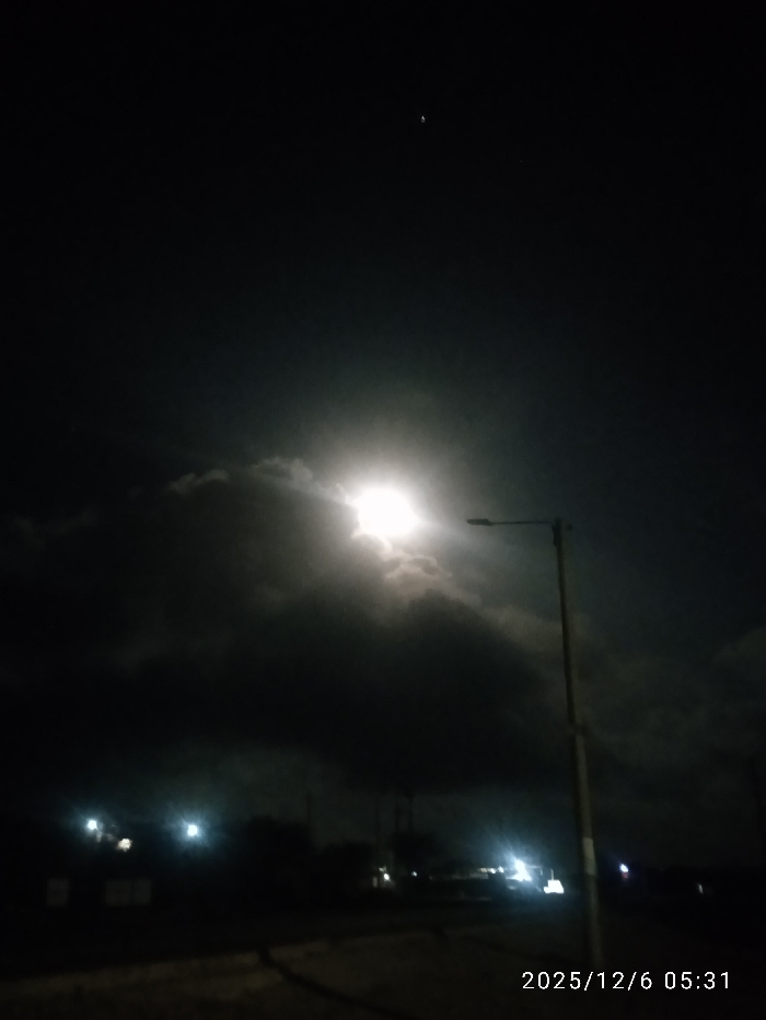 A nighttime landscape features a bright moon obscured by dark clouds, casting a diffused glow. A streetlight stands on the right, its beam contrasting with the moonlight. Below, a road leads into the distance where faint lights suggest buildings or vehicles. The darkness dominates, punctuated by the bright moon and scattered lights. The date "2025/12/6 05:31" is printed at the bottom.