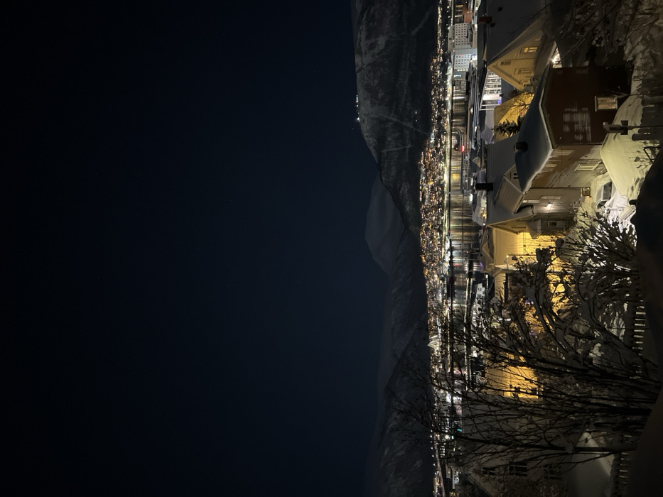 A nighttime, low-angle view of a city nestled alongside mountains. Building lights illuminate snow-covered roofs and branches of trees. The city lines a body of water, its lights reflected in the still surface. Mountains rise sharply along the left side, their peaks fading into the dark sky. A stark contrast exists between the inky darkness of the sky and the bright glow of the urban landscape.