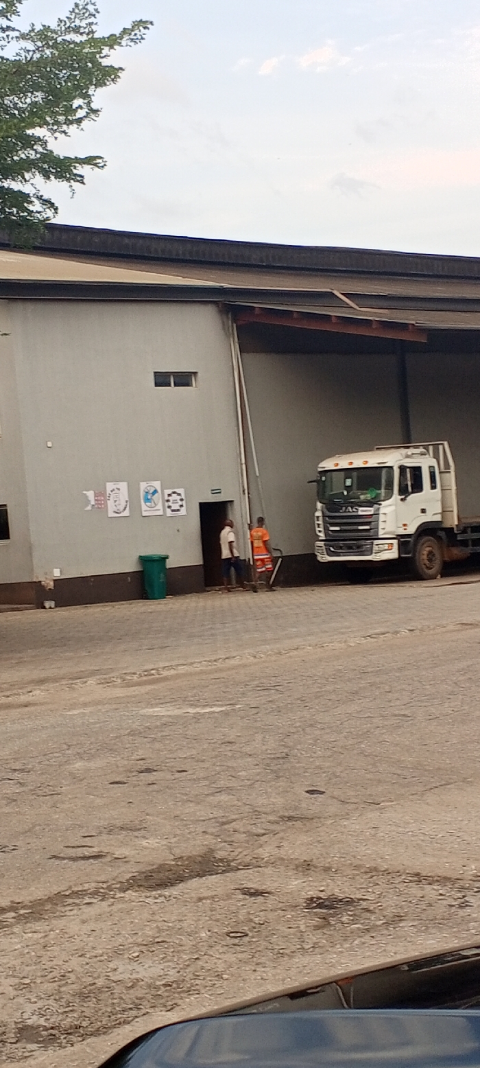 The scene depicts an exterior view of a large, light-grey industrial building in Akure, Nigeria, under a partially cloudy sky. The building features a dark brown/black roofline, a small rectangular window on its upper left facade, and three square-shaped informational posters displayed to the left of a dark doorway. A green cylindrical waste bin is positioned next to the wall, left of the doorway. Two adult males are present near the doorway. One male, wearing a light-colored short-sleeved shirt and dark lower garments, stands facing right, partially obscured by the doorway. A second male, clad in an orange short-sleeved shirt and orange-and-white patterned shorts, stands to the right, facing towards a parked vehicle, holding a long, dark object extending towards the ground. A white JAC brand commercial truck with multiple amber roof lights is parked partially under a dark, expansive roof overhang or awning on the right side of the building. A light-colored pole or pipe leans vertically against the building wall near the edge of this overhang. The ground surface in the midground and foreground is a worn, light-colored concrete or paved area exhibiting cracks and dark stains. The upper portion of a dark-colored vehicle is visible in the immediate foreground, bottom right. A tree with green foliage is visible in the upper left quadrant of the frame, partially obscuring the sky and building roof.