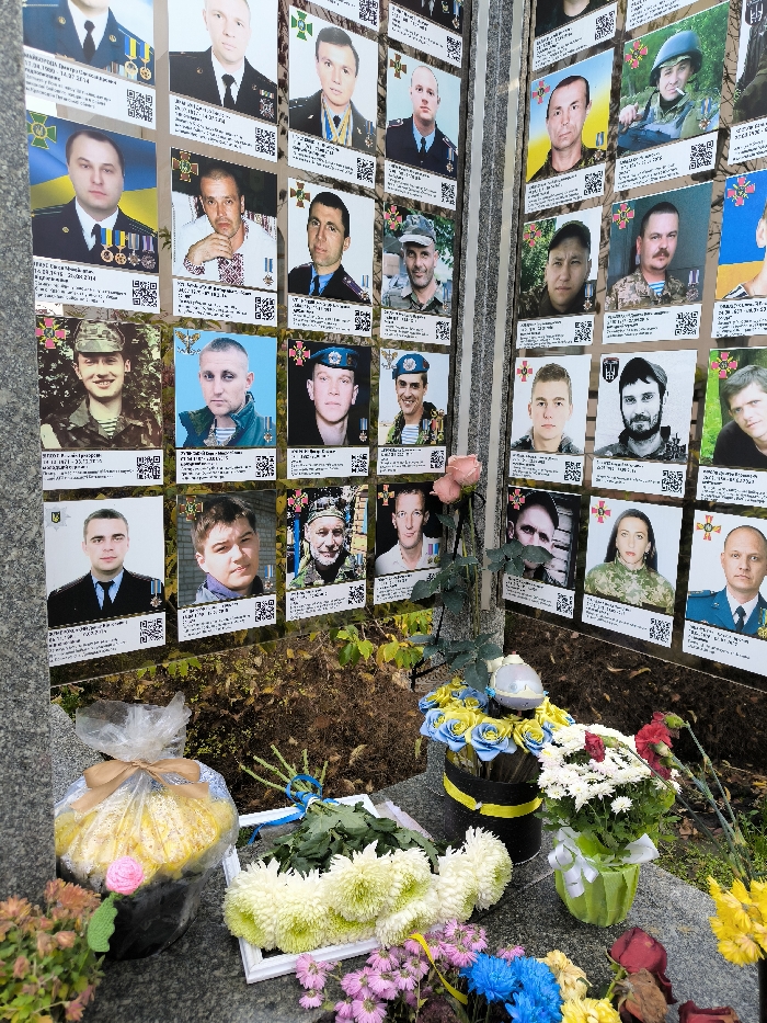 The image depicts a section of a memorial wall located in Vinnytsia, Ukraine