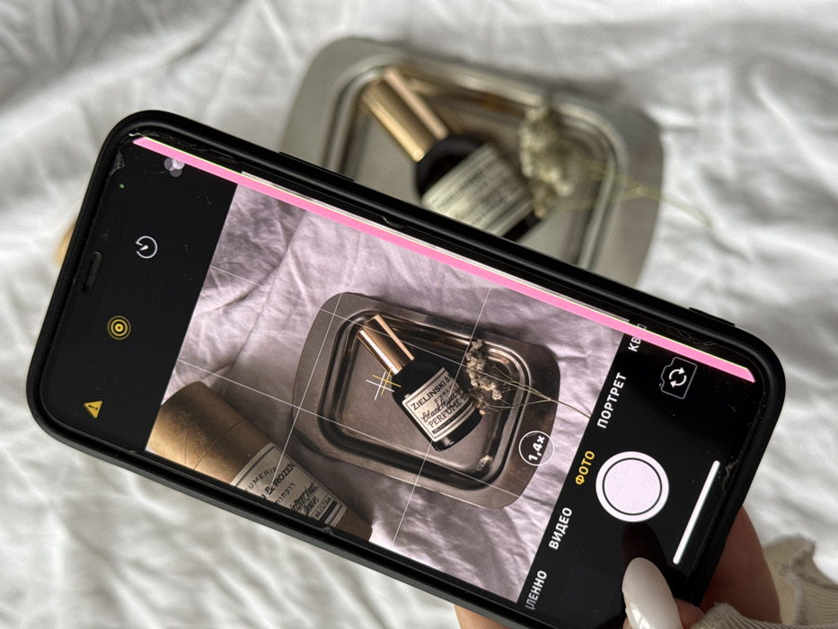 A left hand, exhibiting light-colored manicured fingernails, holds a black smartphone encased in a black protective cover. The smartphone's display shows its camera application in "ФОТО" (Photo) mode, with a grid overlay and a "1.4x" zoom factor visible. The screen frames a flat lay composition consisting of a dark-colored perfume bottle with a gold-toned cap, labeled "ZIELINSKI & ROZEN PERFUME," resting diagonally on a small, rectangular, silver-colored metallic tray. Adjacent to the bottle are several small, dried, light-colored floral sprigs. A cylindrical brown cardboard tube, partially visible at the upper left of the screen, bears the text "LUMELI & ROZEN PERFUMERIE." These items are arranged on a crumpled, light purple fabric surface. A prominent pink vertical line defect is present on the right edge of the smartphone's screen, with minor chips visible on the screen's bezel, particularly near the upper right and lower left corners. The smartphone itself is positioned over a crumpled white or very light-colored fabric surface. In the blurred background, to the right of the smartphone, an out-of-focus arrangement of a similar perfume bottle and tray is discernible, suggesting the actual subject being photographed. The image contains no visual elements to identify the specific geographical location as Krasnodar, Russia.