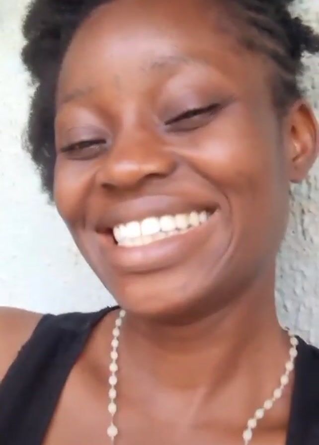 A young, dark-skinned woman smiles at the camera in a close-up shot. She wears a black tank top and a beaded necklace. Her hair is styled in small braids at the front, with the rest of her hair appearing natural and curly. She looks to the side briefly and then back at the camera, smiling again and touching her hair. The background is a textured wall.