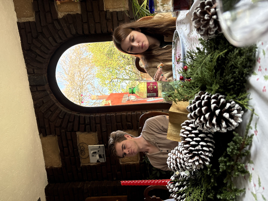- "A slightly tilted indoor shot shows two people seated at a table decorated with pine cones and greenery" by FM-FnHOE2, licensed under CC BY 4.0