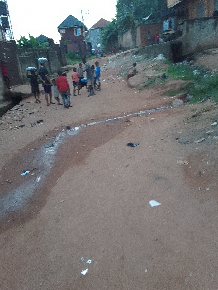 The scene depicts an unpaved, reddish-brown dirt street in a residential area of Unknown, Unknown, under ambient lighting conditions. Ten individuals are present. On the left midground, one individual moves leftward, balancing two large white sacks on their head. A cluster of seven to eight children or adolescents stands in the center-left of the street, facing each other. On the right midground, a single child sits on a low dirt mound. A person in a red shirt is partially visible on the far left, adjacent to a dark metal gate. The street surface is uneven and features a damp, lighter-colored trail running diagonally from the mid-left towards the right foreground. Scattered debris, including white paper fragments and a single black flip-flop, is visible on the dirt. Buildings lining the street include multi-story residential structures with varied roof designs (dark grey, reddish-brown) and fences (metal gate, concrete walls). Sparse vegetation, consisting of weeds and distant trees, is present. A utility pole structure is visible on the far upper left.