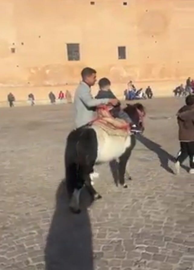 man leading a small, white and black pony with a child riding on it across a stone-paved square. The pony is wearing a saddle. The man is wearing a light gray sweater and white sneakers. The child is wearing a black jacket. Other people are visible in the background, walking around or sitting near a high, light brown wall that surrounds the square. The sky is blue and the sun is shining. Arabic music plays.