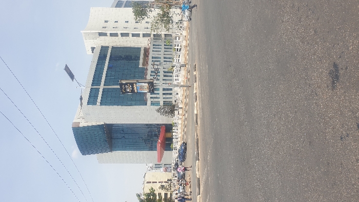 The scene depicts a clear daytime view of a major intersection in the Maitama District of Abuja, Nigeria. The primary subject is the National Communications Commission (NCC) Headquarters, a multi-story building with modern architecture, prominently featuring curved, dark blue-tinted glass curtain walls and lighter grey paneling. A distinct red canopy or overhang is visible at a lower level of the building, marking an entrance. In the foreground, an asphalt road surface occupies the lower half of the frame. A concrete median, topped with a dark border, separates the immediate foreground from the main traffic lanes. A tall, dark grey street light pole equipped with a rectangular solar panel and multiple dark advertising panels, one displaying "GMD," stands centrally on this median. Overhead, several thin electrical wires are visible against the clear, pale blue sky. On the left side of the road, approximately five to seven individuals, including men and women, are observed walking or standing on a paved area or sidewalk. Several parked and moving vehicles, including what appears to be a dark sedan, are present in the midground traffic lanes. On the far right, a single individual in a blue shirt is seen with a raised arm, seemingly walking or signaling near the edge of the road. Scattered trees and small shrubs are visible on the periphery of the scene and in front of the NCC building.