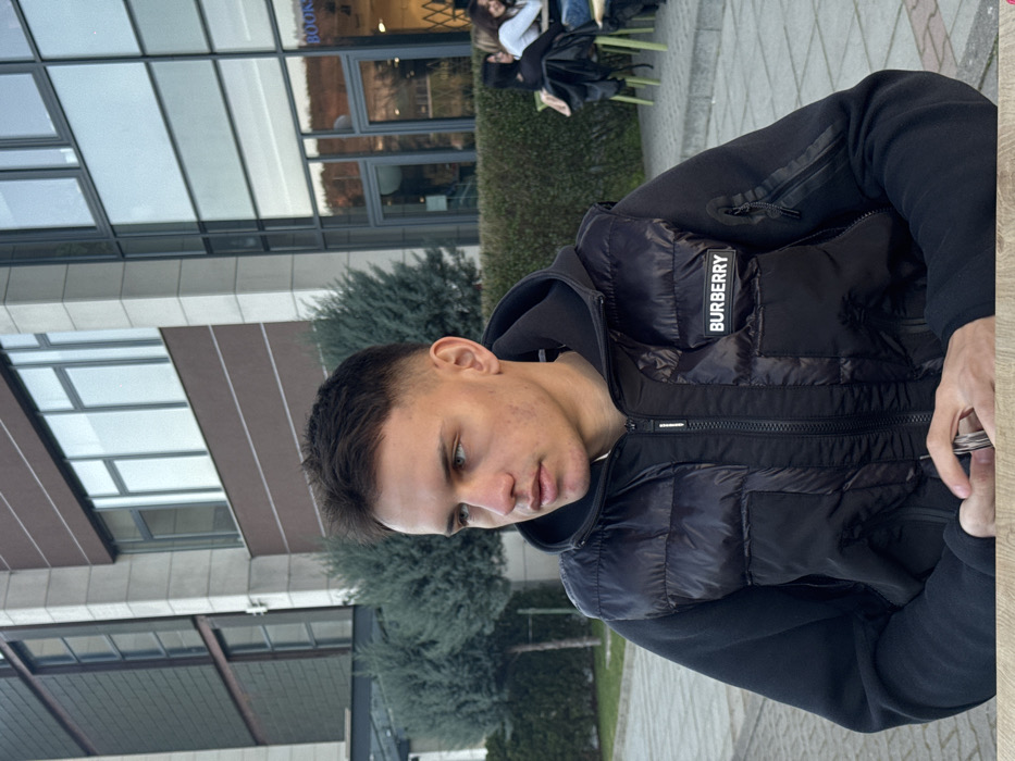 A young male subject, appearing approximately 18-25 years old, is seated at an outdoor table