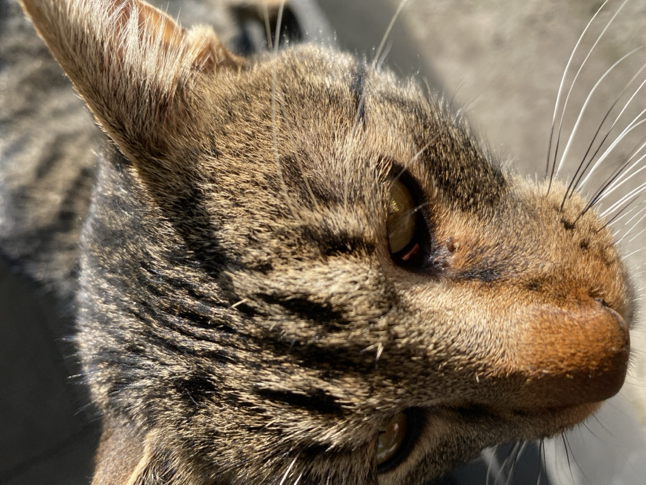 A domestic short-haired tabby cat is depicted in a close-up, high-angle perspective, situated in Palilula Urban Municipality, Serbia. The cat's fur exhibits a brown and black striped pattern. Its amber-colored eyes are directed slightly downward or towards the viewer. A reddish-brown nose and prominent white whiskers are visible. A small, dark epidermal blemish is noted below the cat's left eye. The scene is illuminated by direct sunlight from the upper right, creating distinct highlights on the fur. The background is out of focus, suggesting a light-toned, possibly paved or concrete outdoor surface.