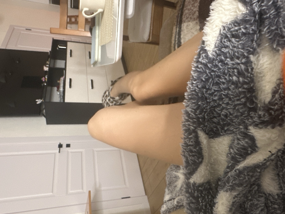 The scene depicts an interior room in Novosergievka, Russia. The lower extremities of an individual are prominent, viewed from a first-person perspective, indicative of the person being seated or reclined. The individual's bare thighs are visible, extending forward. Their feet are adorned with leopard-print slippers. A thick, fluffy blanket, patterned in gray and white stars, covers the lower legs and extends into the immediate foreground. The flooring is light-toned wood. In the background to the left, a white paneled door with a black handle is partially open. To the right of the door, a large, dark television screen is positioned above a black and white dresser or media console. This furniture piece features an open shelving compartment on top and three white drawers with black horizontal handles below. Several small, assorted decorative items are arranged on the top surface of the console. Further to the right, a light-colored wooden chair is situated beside a white table. On the table, a woven placemat, a white mug, and a light blue rectangular tray are present. The room is illuminated by ambient interior lighting.