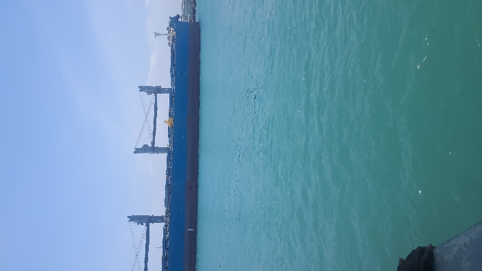 The image displays a large cargo ship, consistent with a bulk carrier, floating on calm, teal-blue water under a clear, light blue sky. The vessel's hull is dark blue, with a distinct maroon section below the waterline. At least four grey-colored deck cranes, equipped with visible rigging, are positioned along the ship's deck, with minor yellow structural components also discernible. The ship appears to be either stationary or moving slowly within a port or channel. A dark, possibly metallic, edge of an unknown structure or another vessel is partially visible in the bottom-left foreground. No individuals, specific actions, or direct interactions are visible. This maritime scene is consistent with a port environment in the Ganjoni/Shimanzi ward of Mombasa, Kenya.