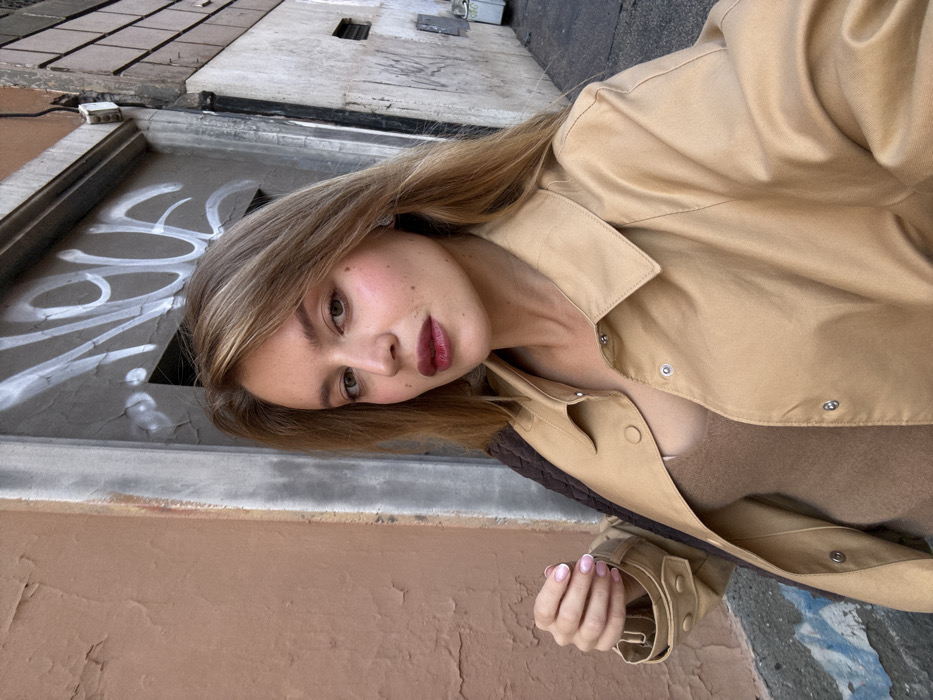 A young adult female is depicted in a close-up, selfie-style photograph, set against an urban backdrop in Rome, Italy. The subject, possessing long, light brown hair, green eyes, and wearing dark red lipstick, faces directly towards the camera with a neutral expression. She is dressed in a tan, collared jacket with visible snap closures, worn open over a brown knit top. A brown woven bag strap is visible over her right shoulder. Her left hand, with manicured nails, is positioned near her jacket lapel. The background features a weathered, terracotta-colored stucco wall on the left. To the right, a gray metal roll-down shutter, covering an opening, is heavily marked with white graffiti, prominently displaying the word "NEVE". Above this shutter, the building facade transitions to a lighter gray material with horizontal paneling. A small, light-colored utility box is affixed to the wall on the far right. Natural daylight illuminates the scene.
