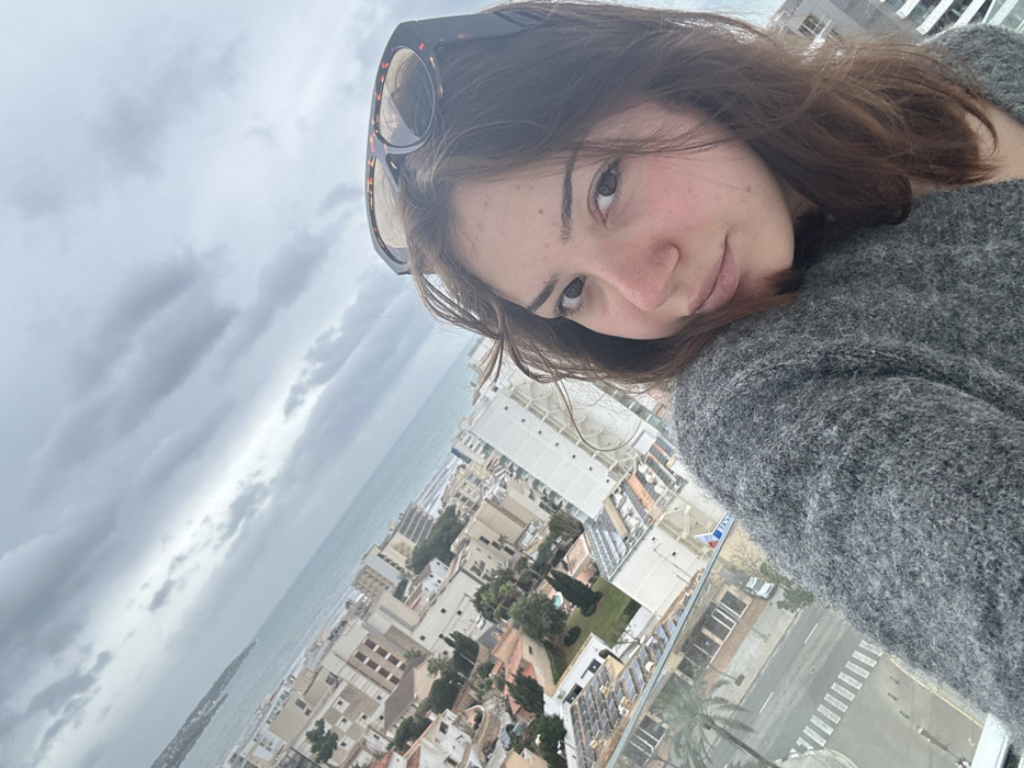 A young female with brown hair, wearing a grey knitted sweater, is depicted in the foreground, looking directly at the camera. Tortoiseshell sunglasses are positioned on top of her head. The scene is captured from a high vantage point, overlooking the city of Les Meravelles, Spain. The urban environment below features numerous multi-story buildings, predominantly light-colored, with some exhibiting red-tiled roofs, and interspersed palm trees. A street with a zebra crossing and a white vehicle is visible directly below. Beyond the city, the sea extends to the horizon, with waves visible near the shoreline and a distant landmass on the far left. The sky is entirely overcast with dense grey clouds.