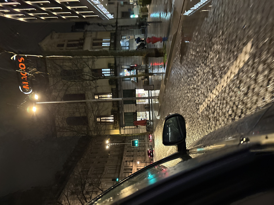A nighttime street scene taken from inside a car. The street is wet, reflecting the lights. Buildings line the street, with the word "MODOS" visible on a sign. Streetlights and traffic signals are present. The car's side mirror is visible. The road appears to be paved with cobblestones. Pedestrians can be seen reflected in the wet pavement.