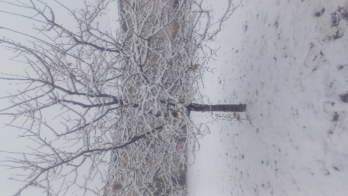 A snow-covered tree stands in a winter landscape. Its bare branches are heavily laden with snow, creating a stark contrast against the grey sky and the white ground. Snow also covers the ground. The tree trunk is visible, supporting the intricate network of branches. The background is a hazy mix of grey and white, blurring the horizon. The image evokes a sense of quiet stillness and the beauty of winter.