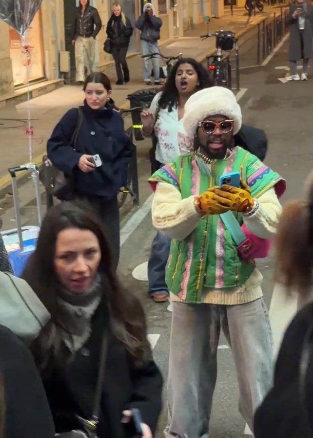 The video depicts a street scene at night. In the center, a man with a beard, wearing a white furry hat, sunglasses, a colorful vest, and orange gloves, dances enthusiastically. He holds a blue smartphone in his hand. A group of people surrounds him, some appear to be taking photos or videos. One woman in the foreground is pulling a light blue suitcase. Bicycles are parked along the sidewalk, and pedestrians are visible in the background. Buildings line the street. A large silver balloon is visible in the left of the frame.