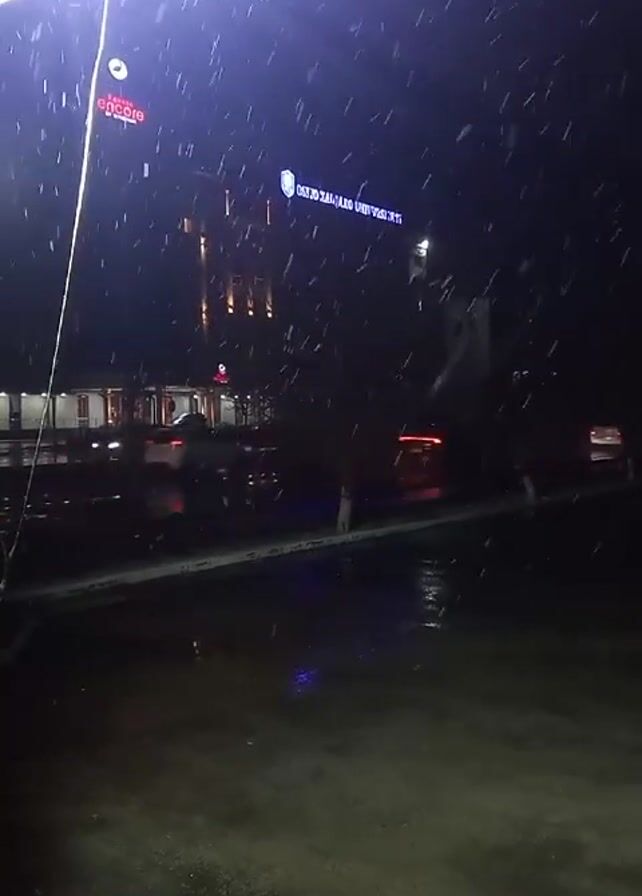 The video depicts a nighttime scene in what appears to be a city. Rain or snow is falling heavily, illuminated by streetlights. In the background, buildings are visible, including one with illuminated signs reading "encore" and "OSTRO ARAL UNIVERSITY STI". Cars pass along a road adjacent to a flooded area, reflecting the lights. The scene is dark with strong contrasting lighting from the streetlights and signs.