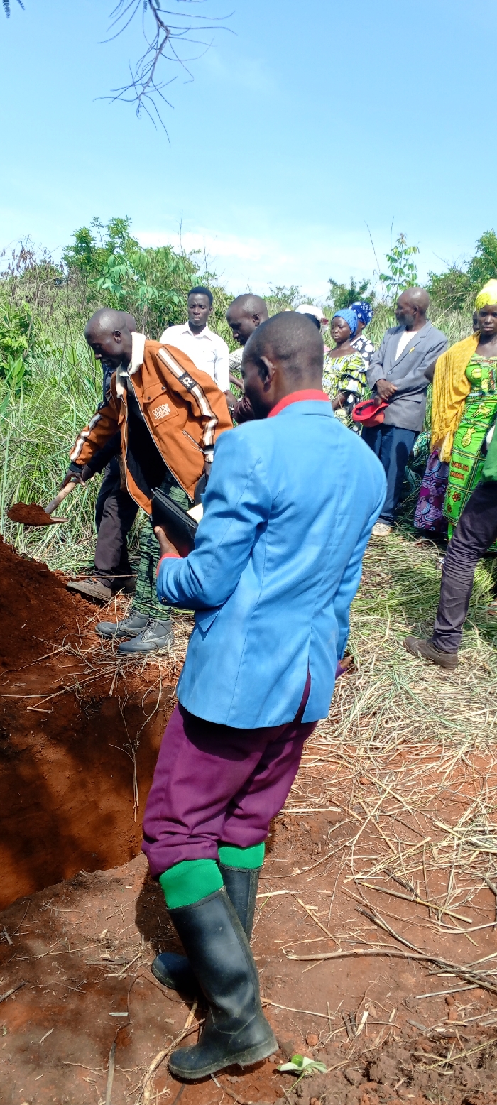 The image depicts an outdoor scene in what appears to be a rural or undeveloped area within the city of Namisha, Democratic Republic of the Congo. A group of approximately ten individuals is gathered around a freshly excavated pit in reddish-brown soil. In the foreground, a male figure is observed from behind, wearing a light blue blazer over a red undershirt, purple trousers, and black rubber boots with green socks visible above the boot tops. He holds a dark, possibly leather-bound, object in his left hand and stands near the edge of the excavation. To the left, a male in a brown and white jacket with a "MOM" logo on the left chest pocket and dark trousers is actively digging into the pit with a shovel, displacing reddish-brown earth. His dark footwear is partially visible. Other individuals are positioned around the excavation, observing the scene. These include: a male in a white collared shirt and dark trousers; a woman with a blue headscarf and a patterned dress; a male in a grey suit jacket and dark trousers; and a woman wearing a bright yellow head covering and a green patterned dress. Additional figures are less distinctly visible in the background. The ground consists of exposed reddish-brown earth with patches of dry grass and scattered organic debris. The excavation is a roughly rectangular pit with steep sides. The surrounding environment features dense green vegetation, including tall grasses and trees, under a clear, bright blue sky with no visible clouds. Bare tree branches are partially visible against the sky in the upper left quadrant. The scene is illuminated by bright natural light.
