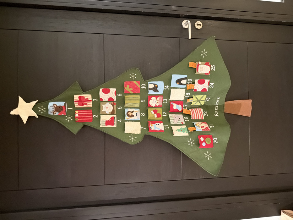 - "A green Christmas tree advent calendar hangs against a dark brown door" by FM-wrSCM2, licensed under CC BY 4.0