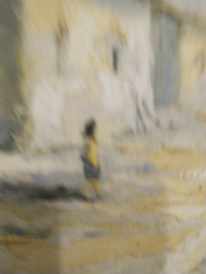 A blurred image shows a figure walking amidst indistinct structures. The palette is primarily muted yellows, creams, and grays, giving the scene a hazy, dreamlike quality. Buildings or rocky formations rise behind the figure, their details obscured by the blur. The ground suggests a sandy or arid environment. The figure's form is vaguely human, but its features are undefined due to the overall lack of focus.