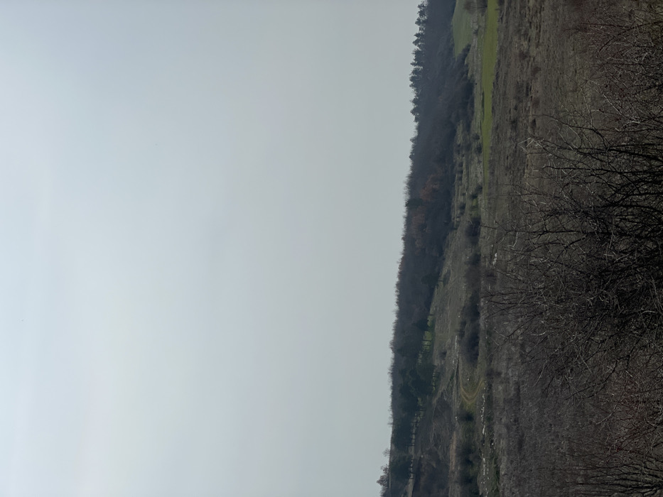 The scene depicts a desolate, rural landscape in the vicinity of Altimir, Bulgaria, under an overcast, light gray sky. The upper two-thirds of the image consist solely of the featureless sky. The foreground is dominated by a dense cluster of leafless deciduous trees and shrubs with dark, intricate branches. The ground immediately beneath them is dry and sparsely vegetated with brown, dormant grass and scrub. In the midground, the terrain undulates with rolling hills. A dirt track, light brown in color, is visible winding uphill on the left side of the frame. Patches of lighter, possibly rocky, ground are present on the slopes. A row of approximately eight small, dark green evergreen trees is situated on a slope in the left-midground. To the right, the midground transitions from dry, brown scrubland to a distinct patch of vibrant green pasture or field. The background features a continuous, dark band of dense woodland, primarily consisting of bare deciduous trees with some interspersed evergreens, marking the horizon line. No people, animals, or man-made structures are visible. The overall environment suggests late winter or early spring conditions.