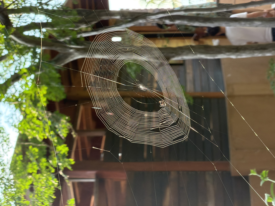 The image displays an illuminated spiderweb, containing one spider near its center and a smaller arthropod on a lower radial thread, positioned in an outdoor environment in Unknown, Mexico. The web's radial and spiral strands are highly visible due to direct sunlight. In the background, a building with dark brown wooden paneling and lighter brown trim is present, partially obscured by green foliage from trees in the upper portion of the frame. Several slender tree trunks are visible on the right side. In the lower-right background, two individuals are partially visible; one in a white t-shirt faces away from the viewer, while a second, further back, wears a patterned shirt and is partially obscured. A light brown wall or surface forms the immediate background at ground level.
