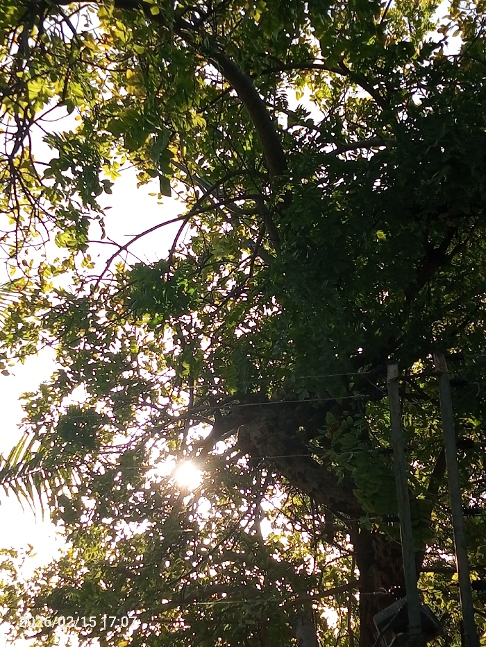 Sunlight streams through dense green foliage. Trees dominate the frame, their branches intermingling to create a canopy. The light creates a starburst effect, highlighting the texture and depth of the leaves. Wires and metal poles cut across the lower right, suggesting a managed or inhabited space. The date stamp at the bottom corner reads "2020/02/15 17:07".
