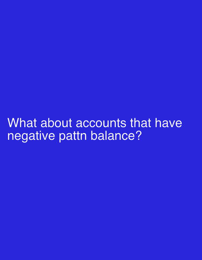 The image is a solid blue background with white text that reads "What about accounts that have negative pattn balance?"