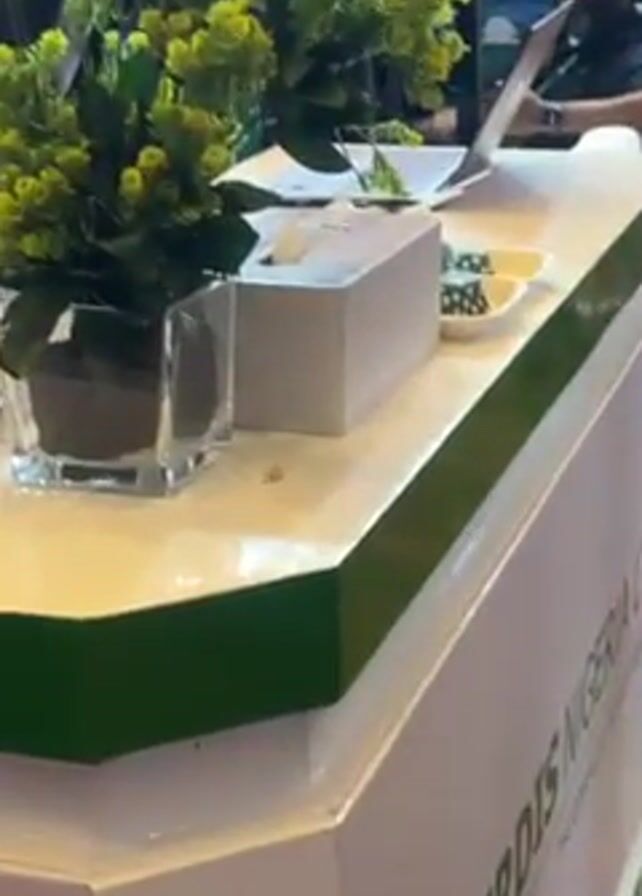 trade show booth. A white counter with a green top is visible, decorated with a flower arrangement in a glass vase, a white tissue box, and two small white trays, one of which contains small green-wrapped candies. A man is seated behind the counter. The camera pans slightly to show the side of the booth, which has the name of a company printed on it. The booth is illuminated with a strip of yellow lights. A hand reaches into the frame and picks something up off the counter. In the background, there are posters or advertisements with images related to shipping. The overall impression is of a business-oriented environment, likely at a trade fair or exhibition.