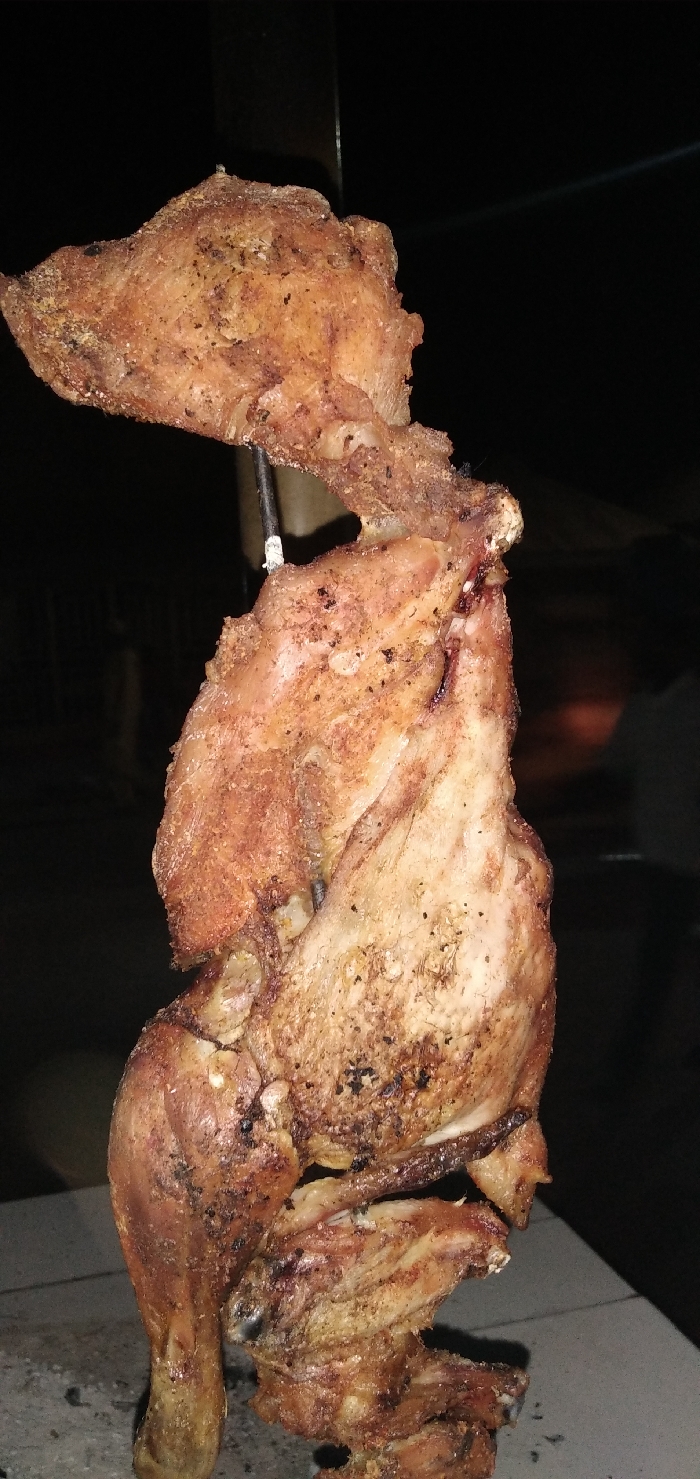 - "The image displays a roasted chicken, vertically mounted on a slender dark metal skewer" by FM-Vamwy2, licensed under CC BY 4.0