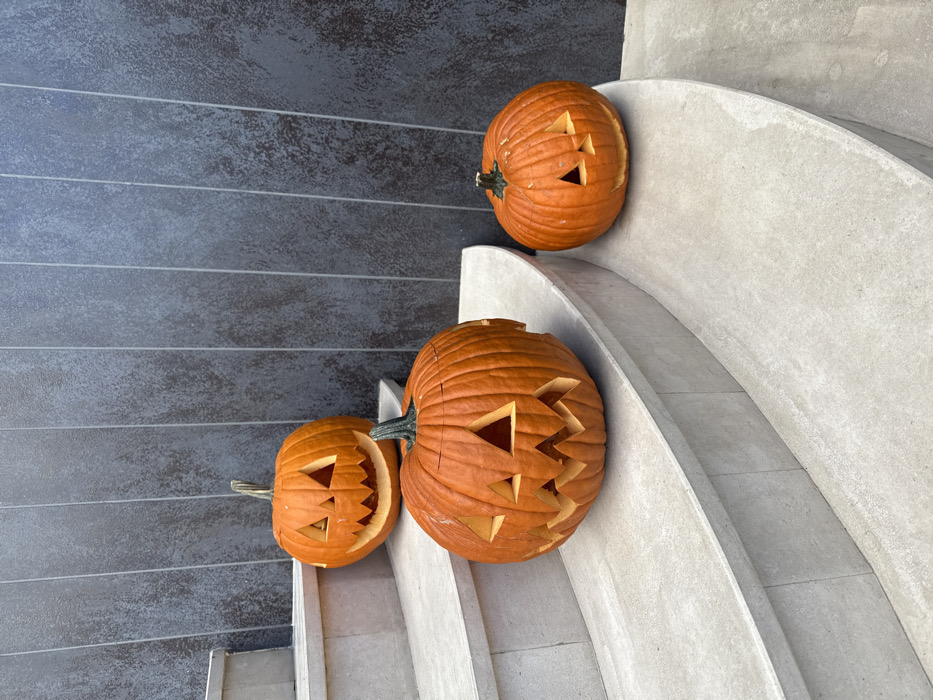 Three carved jack-o'-lanterns are displayed on light-colored, curved outdoor stairs in Budva, Montenegro, against a dark, vertically paneled wall