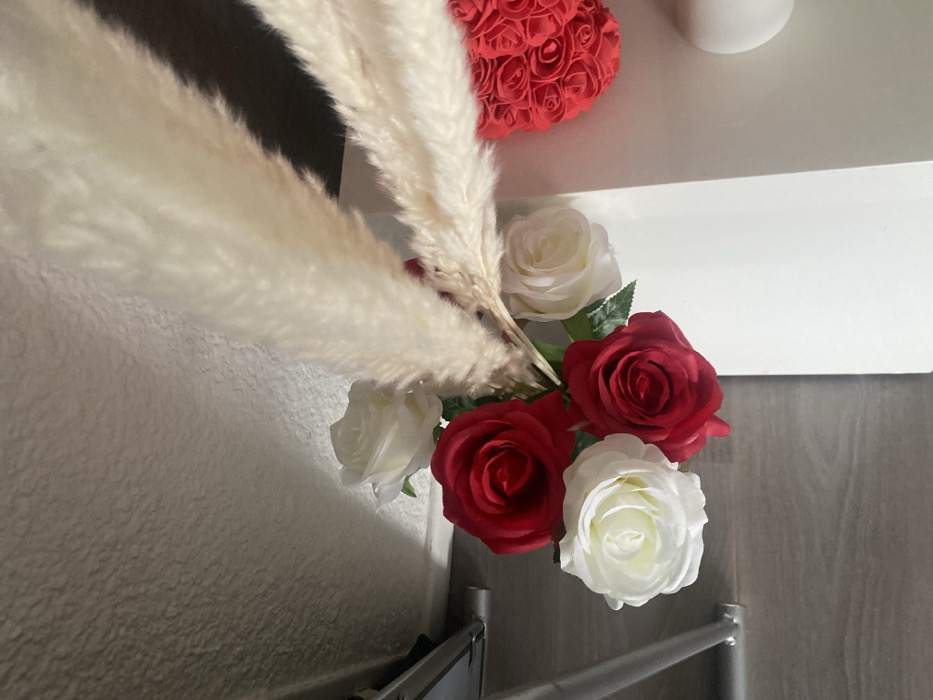 The image depicts an indoor scene in an Unknown City, Unknown State/Country, focused on an arrangement of artificial flowers and decorative items. In the center, a bouquet composed of four red artificial roses, three white artificial roses with green plastic leaves, and several beige artificial pampas grass plumes is prominently displayed. The bouquet originates from a white, rectangular object, likely a vase or container, which rests on a flat, white surface, presumably a table or shelf. To the right of the bouquet, a red heart-shaped decorative object, textured with numerous small rosettes, is partially visible. Further right, a portion of a smooth, matte white, semi-spherical object is also visible on the white surface. The background features a light-colored wall with a textured, possibly stucco or plaster, finish. In the lower left quadrant, a light-toned wooden or laminate floor is present. A silver-toned metallic tube or rod, part of an unidentified piece of furniture or stand, is visible in the extreme lower-left corner. No animate subjects or interactions are present; the objects are static and arranged for display under indoor lighting.