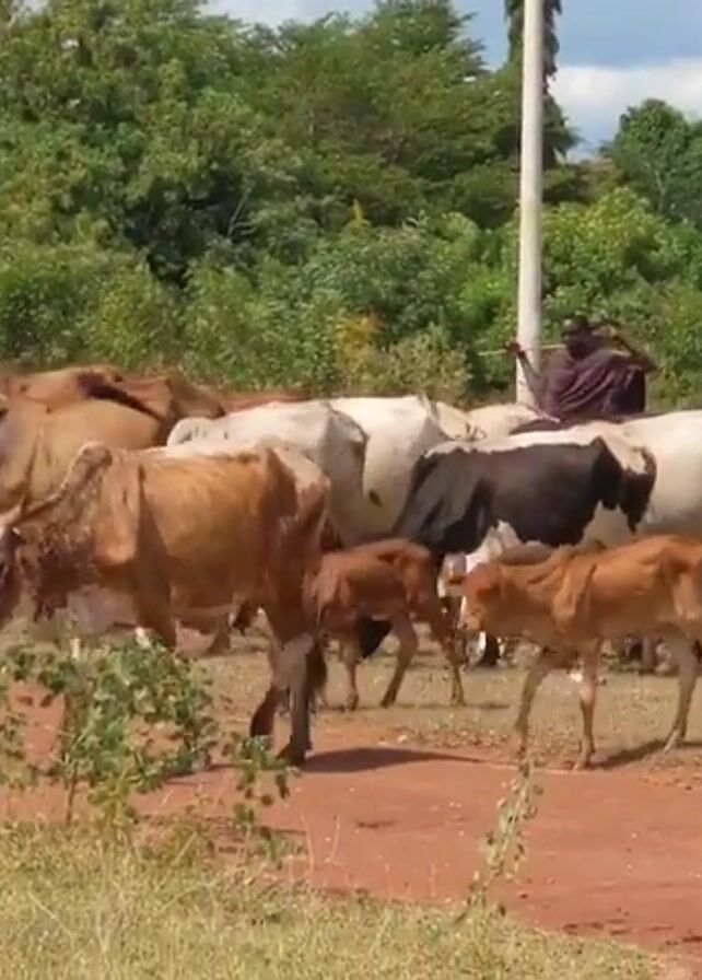 herd of cattle, including cows and calves, grazing in a grassy field with a red dirt path running through it. The cattle are of various colors including brown, white, and black. A person, possibly a herder, is standing behind the cattle. In the background, there are trees, power lines, and buildings with red tile roofs. The sky is partly cloudy. The cattle are actively grazing on the grass.