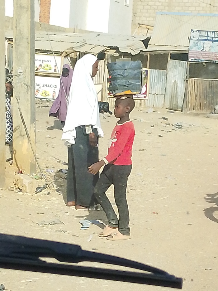 A boy with black pants and a red shirt carries a stack of containers on his head. He wears light-colored sandals and stands next to a woman in a white hijab and dark skirt. They are on a dirt road in front of buildings, some with signs that say "Snacks" and another with "Tea & Snacks." A second woman in a purple robe stands in the background, with trash visible on the ground. A car windshield is visible at the bottom of the frame.