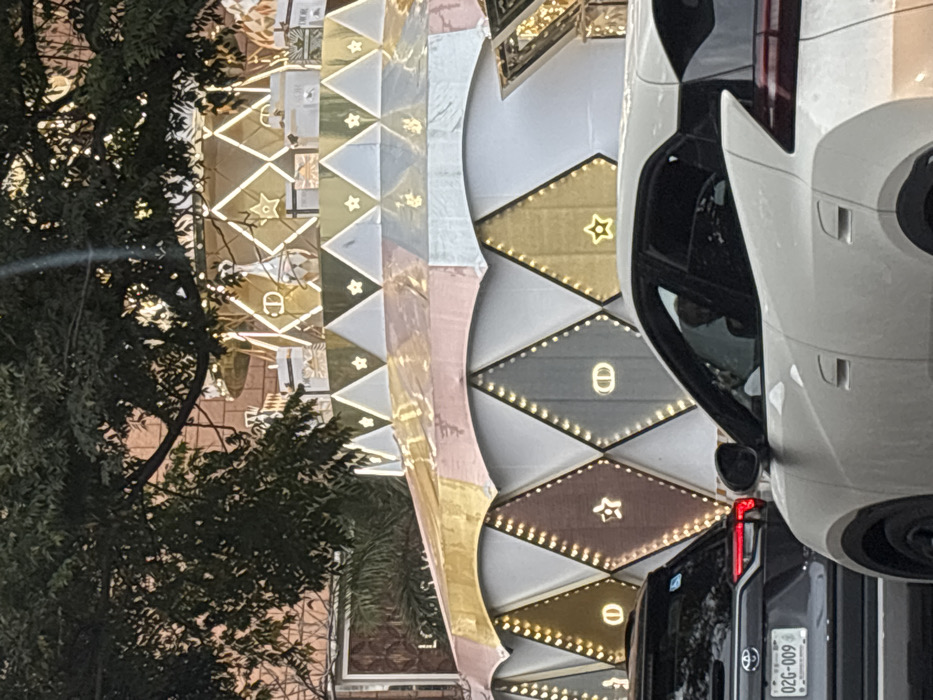 The image depicts a luxury building facade with geometric diamond patterns adorned with stars and the letter "O". The building's colors range from gold to pink and white. Lush green trees are visible on the left. Two parked vehicles are present; a white car is visible on the right side and a dark-colored car on the lower right, whose license plate is partially visible.