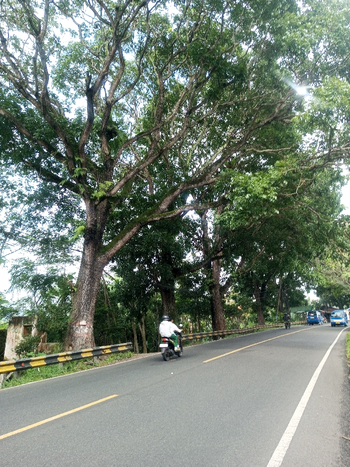 A two-lane asphalt road curves beneath a canopy of large trees. A single yellow line divides the lanes, and a white line marks the road's edge. A motorcyclist travels along the road, heading away from the viewer. A yellow and black guardrail protects the roadside. Several other vehicles can be seen in the distance. The trees are large and mature, with a mix of green leaves and exposed branches.