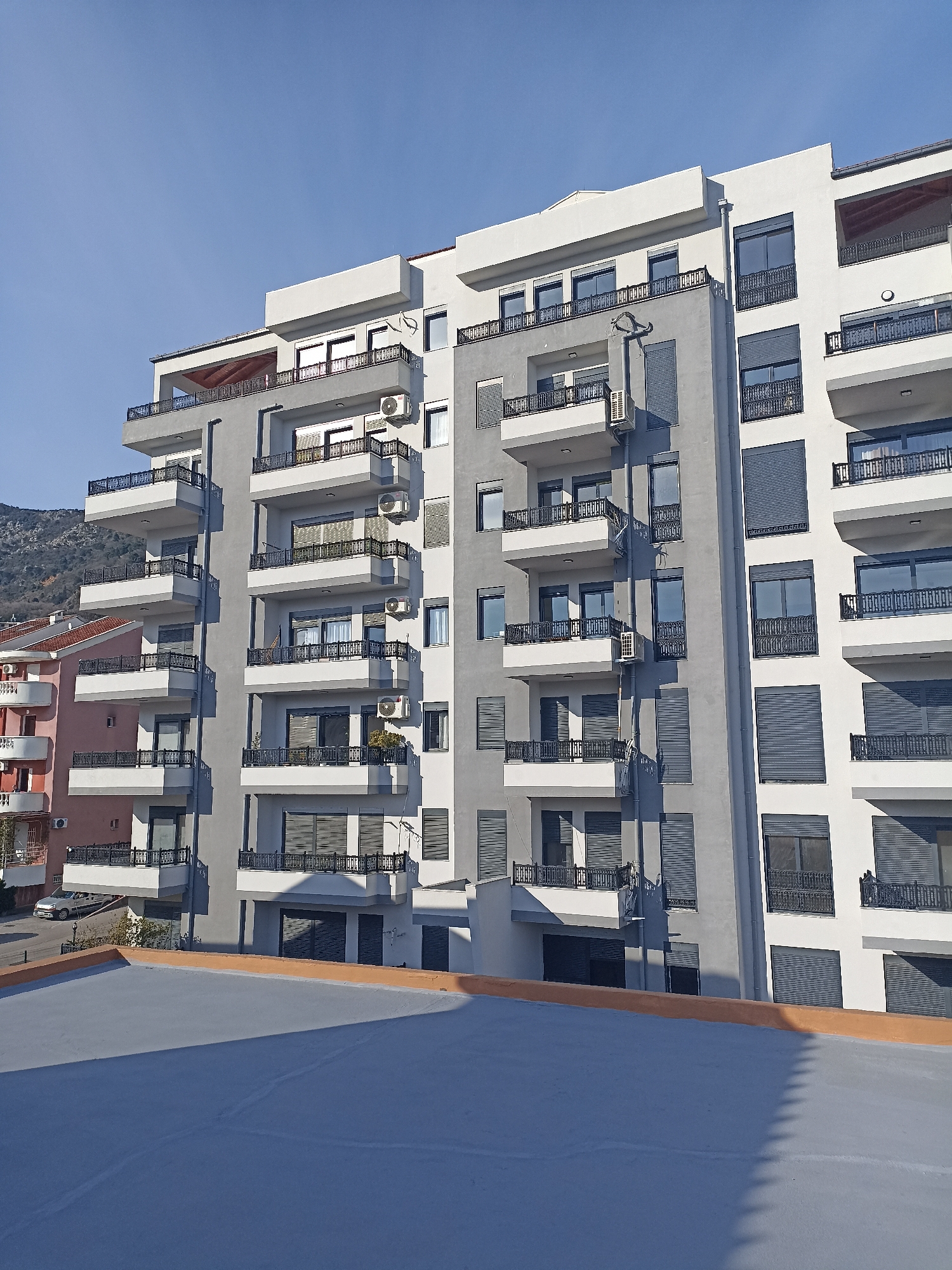 This image depicts a modern, multi-story apartment building in Budva, Montenegro, viewed from a slightly elevated position. The primary building features a facade composed of alternating sections of light grey and white. It is characterized by numerous balconies with dark, ornate metal railings. Many windows and glass doors are fitted with dark grey roller shutters, while others are reflective, showing a clear blue sky. Multiple external air conditioning units are mounted on the building's exterior walls. To the left of the main building, a section of an older, pink/salmon-colored building with a red-tiled roof and white balconies is visible, with a silver sedan partially parked on an asphalt street between the structures. The foreground consists of a flat, light grey rooftop with a low, orange-brown parapet, showing shadows cast from an unseen structure. In the distant background, a mountain range with some vegetation is visible under a clear blue sky. No individuals are discernible within the frame, and no specific actions or interactions are depicted.