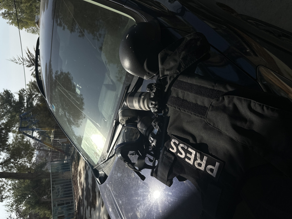 - "A black protective vest with a white "PRESS" patch, a black gas mask with clear visor and filter, a black digital camera with a white Canon telephoto lens, and a black protective helmet are displayed on the dark-colored hood of a vehicle" by FM-RIphO2, licensed under CC BY 4.0