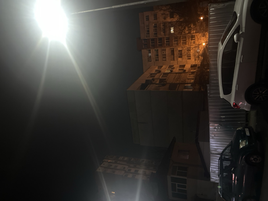 This image depicts a nighttime urban street scene in Shumen, Bulgaria. The sky is dark, illuminated primarily by a very bright street light pole positioned in the upper-right, producing significant lens flare. In the background, a tall, slender multi-story building, lighter in color, is visible on the upper-left. Adjacent to it in the mid-ground, a wider, darker multi-story building with a flat roof stands. To the right of this dark building, another multi-story residential building, appearing to be 5-7 floors, is partially illuminated by interior lights from several windows, casting an orange glow. Bare tree branches are visible in front of this illuminated building. A smaller, single-story house with a white-framed enclosed balcony or extension is present in the lower-left. A corrugated metal fence, likely a temporary construction barrier, runs horizontally across the mid-ground, separating the buildings from the street level. Two vehicles are parked on the street in the foreground. On the right, a white SUV/crossover, possibly a Suzuki SX4, is parked facing away from the viewer. On the left, a dark green sedan or hatchback is parked facing the viewer. The front license plate of the green vehicle displays "H 4708 BA", confirming the location as Shumen, Bulgaria (H is the regional code for Shumen). No individuals are visible, and no discernible actions or interactions are occurring.
