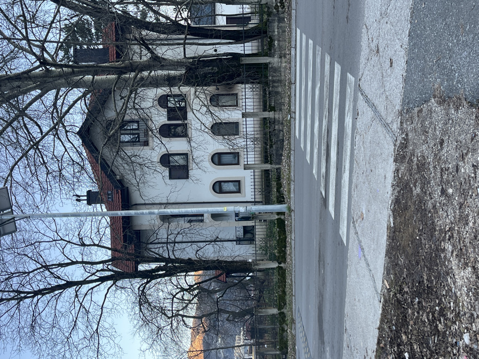 The image displays a street scene in Cetinje, Montenegro. A multi-story building, constructed with white stucco walls and a reddish-brown tiled roof, occupies the background. The building features arched windows on the lower and mid-levels, several equipped with dark brown shutters, one of which is partially open. An upper floor includes a small balcony with a black wrought-iron railing. A black chimney stack is visible on the roof, topped with two dark, finial-shaped objects. Several deciduous trees with bare branches are situated in front of and around the building, obscuring parts of its facade. A tall, grey metallic pole, likely a street light with a solar panel assembly, stands centrally in the mid-ground. A dark metal fence, supported by concrete posts, runs along the property line in front of the building, separating it from the street. Behind the fence, low, dark shrubbery is present. The foreground consists of a paved road surface with a pedestrian crosswalk (zebra crossing) marked by white stripes. A concrete sidewalk is visible to the left, adjoining a patch of dark soil and minimal vegetation. The scene is illuminated by daylight under a clear, light blue sky. No individuals, vehicles, or animals are present in the frame.