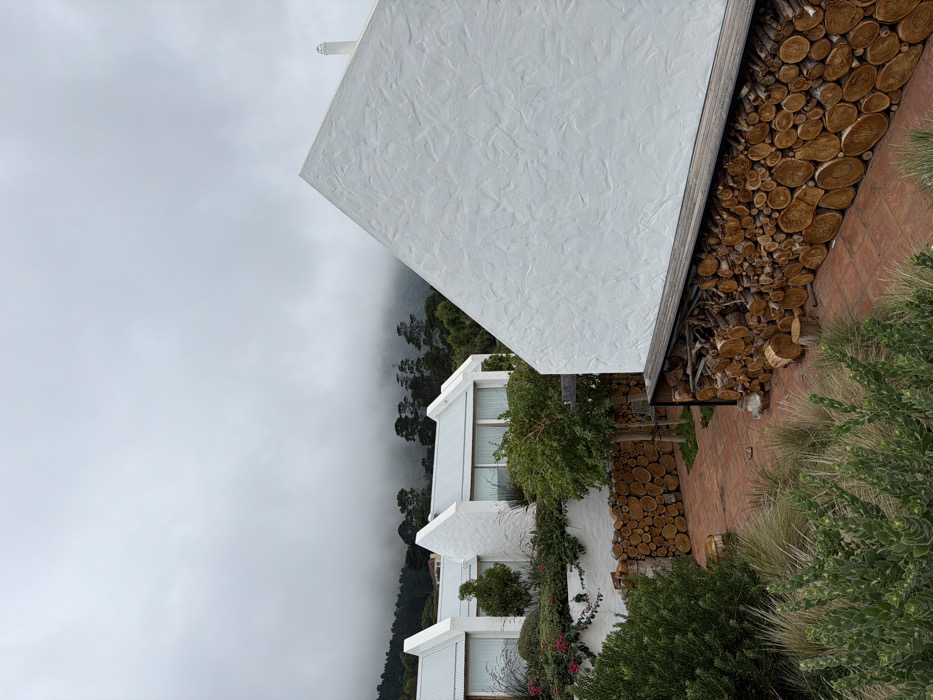 The scene depicts an outdoor architectural and garden setting in Hout Bay, South Africa, on an overcast day. A prominent, textured white building gable end, featuring a steeply sloped roofline and a slender white chimney near its apex, occupies the right side of the frame. Below this wall, a dark, long wooden bench or shelf extends horizontally, beneath which a substantial, neatly stacked pile of cut firewood is arranged. The firewood consists of various sized logs and smaller pieces, with several larger tree stumps positioned nearby on a reddish-brown tiled surface. To the left, a series of interconnected white buildings with modern, minimalist designs are visible. These structures feature corrugated metal roofs, large horizontal windows often fitted with white blinds or curtains, and textured white walls. Lush green vegetation, including shrubs, grasses, and small trees, surrounds these buildings, with flowering pink/red plants cascading over a low white wall. Another stacked woodpile similar to the foreground one lines this low wall. A reddish-brown tiled patio or pathway traverses the midground. The background reveals a dense, dark green forested hillside or mountain range, partially obscured by thick, low-lying grey clouds or fog, indicating an overcast and potentially misty environmental condition. No individuals, actions, or interactions are present in the image.