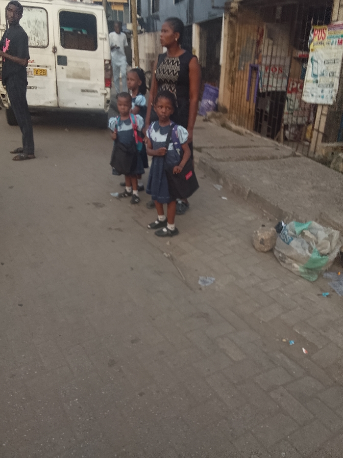 Three young girls in blue school uniforms, complete with white socks and black shoes, stand on a paved street next to a woman in a black dress. Each girl carries a black bag. Behind them, a man in a white shirt and pants stands near the back of a white van. Another man in a black shirt and pants stands to the left of the van. To the right, there is a sidewalk with litter and a building with various posters and signage.