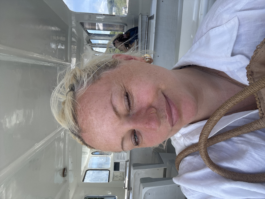 A light-skinned female with blonde hair and a freckled complexion is centered in the foreground of a passenger vessel interior, located in the city of Unknown, British Virgin Islands