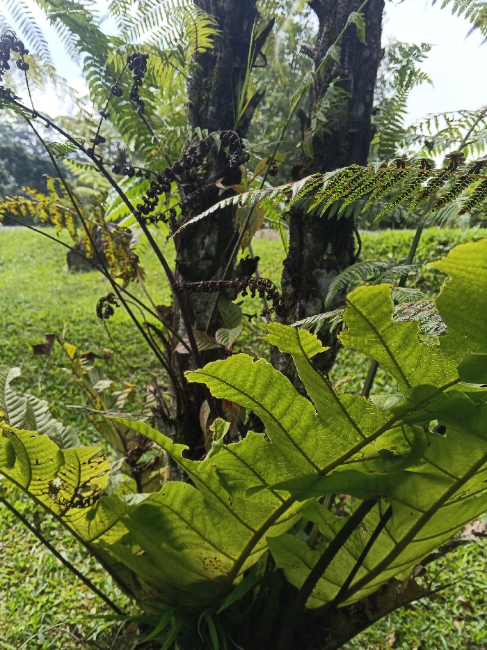 The scene depicts a lush, outdoor natural environment, likely in the vicinity of Bangalum Bridge, Papua New Guinea. The foreground is dominated by large, broad, vibrant green leaves of a plant, possibly a fern, exhibiting visible venation and some minor natural damage or holes along their edges due to backlighting. In the midground, two rough-barked tree trunks stand prominently, with various ferns and smaller plant growth, including dark, coiled structures resembling immature fern fronds or sporangia, attached to or growing near them. The background features a blurred expanse of green grass under an overcast or bright sky. No individuals or human-made objects are visible within the frame. The overall impression is one of dense, tropical or sub-tropical vegetation under natural daylight conditions.