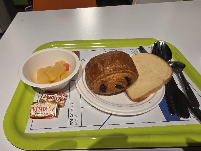A green tray holds a breakfast meal. A white bowl contains cut fruit, alongside two small packets of President butter. A white plate holds a pain au chocolat and a slice of white bread. To the side are a knife, fork, and spoon. The tray sits on a white surface.