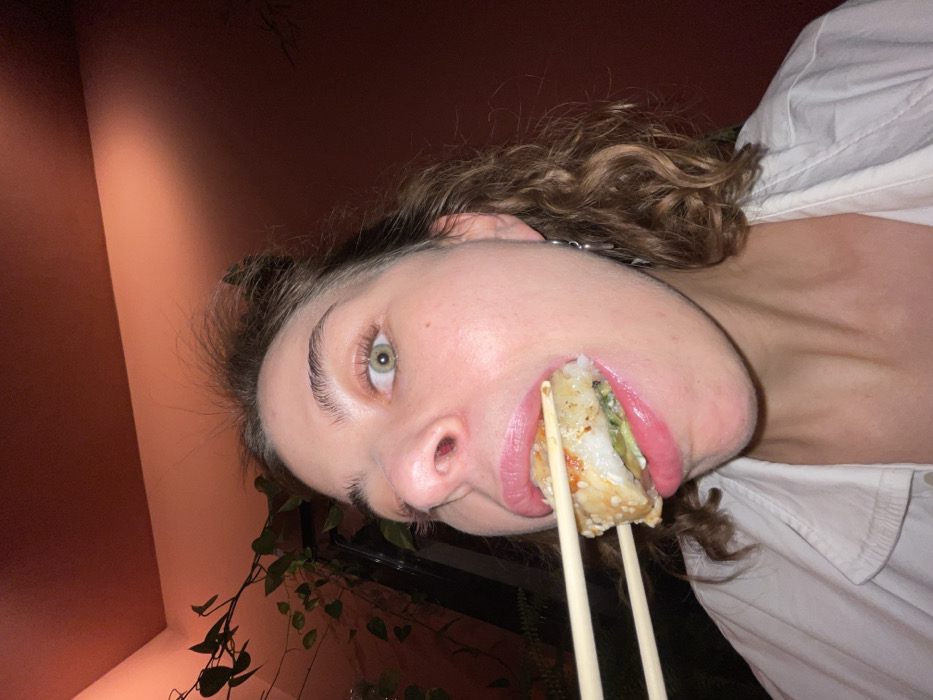 - "A woman with curly brown hair and fair skin is holding a piece of sushi in her mouth using chopsticks" by FM-GgSpJ3, licensed under CC BY 4.0